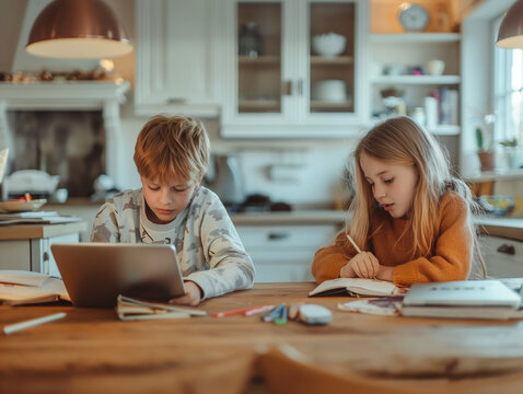 Homeschool, education and distance learning for children while mother helps son and daughter. Parent teaching and bonding with kids with home school homework, and education test for math and English