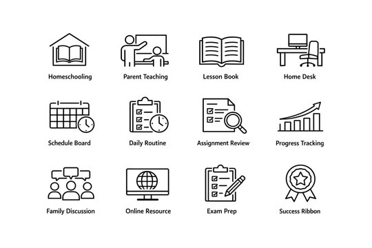 Education symbols: homeschooling, teaching tools, online resources, and progress tracking icons