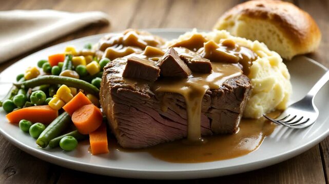 American homestyle cuisine featuring a robust pot roast covered in gravy, paired with mashed potatoes and assorted vegetables.