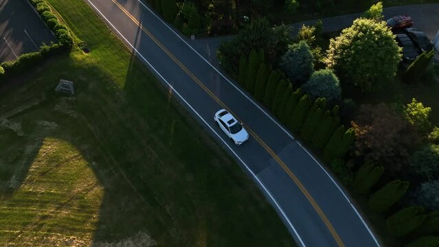 Tracking shot of Honda Civic driving through residential neighborhood. Midsize sedan travel through rural farmland. Suburbia with sunflare at sunset.