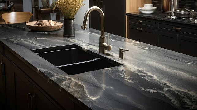 Dark grey marble tiles elegantly arranged subtle gold veining. AI Generated