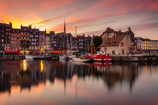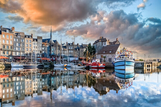 Honfleur, beautiful city in France, the harbor at sunrise, reflection on the river