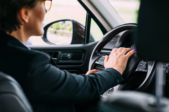 Annoyed Caucasian driver woman businesswoman driving car city girl automobile steering transport traffic jam auto vehicle honk signal conflict accident female travel business rental service gesture