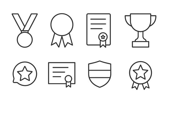 outline vector icons of school awards: medal, ribbon, honor roll, trophy, star sticker, merit certificate, badge icon, achievement icon. set of line style icons in a modern, minimalist design.