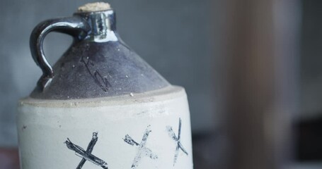 A corked ceramic jug of moonshine liquor marked with the letters 'XXX' sits with the background out of focus.