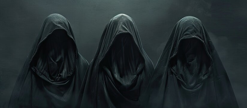 Three ominous figures stand in the shadows, their faces hidden by dark hooded cloaks. The eerie scene exudes an air of mystery and foreboding.