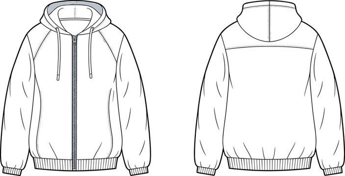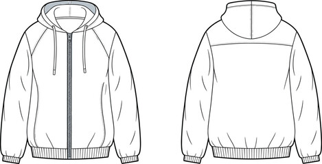 Long sleeve Hoodie jacket design flat sketch Illustration, Hooded sweater jacket with front and back view, winter jacket for Men and women. for hiker, outerwear and workout in winter