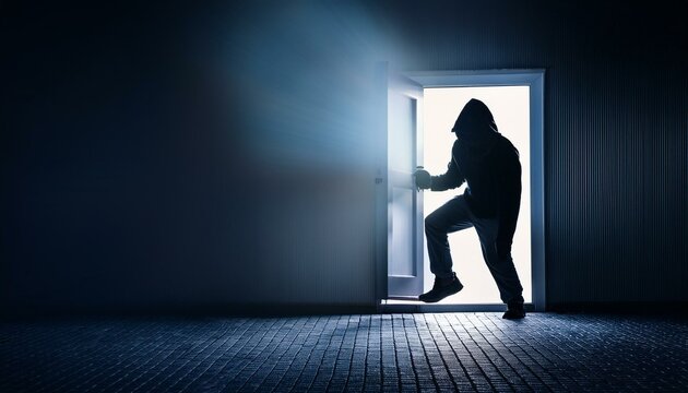 A burglar broken in or breaking into a residential home; a criminal wearing a hoodie committing a burglary; home invasion or home break in; crime scene; robbery and burglary