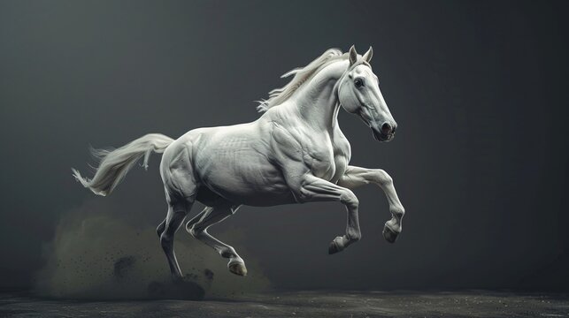 A horse is running through a stream of water. The water is splashing up and around the horse's legs, and the horse's hooves are creating ripples in the water. The scene is peaceful and serene