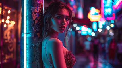 Sexy woman in a dress next to a pole on the street at night neon light nightlife bar club