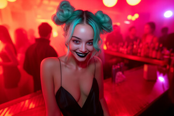 Flirty smiling woman with turquoise hair in double buns and black lipstick, enjoying vibrant night out in lively nightclub with red lighting, speed dating hookup with escort lady of the night