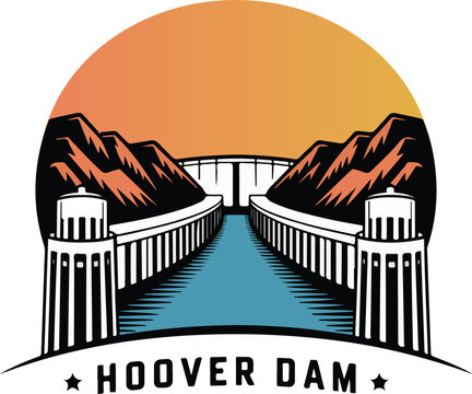 A stylized illustration of the Hoover Dam with a vibrant sunset in the background