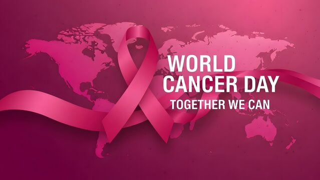 World cancer day awareness ribbon with a world map background and hopeful message