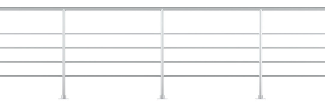 realistic chrome metal guardrail structure with horizontal bars. polished silver steel fencing isolated for architectural visualization.