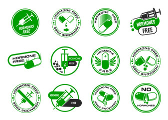 Hormone free icons, healthy organic food stickers and labels, vector stamps. Natural farm meat and no GMO products sign, USDA no hormones icon with syringe and pill for healthy food package badges
