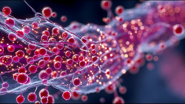 Microscopic science view of flowing stress hormone cortisol molecules inside blood vessel, dynamic biological concept