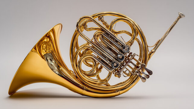 A shiny golden French horn displayed against a white background. The brass instrument’s elegant coils, valves, and flared bell reflect light beautifully.