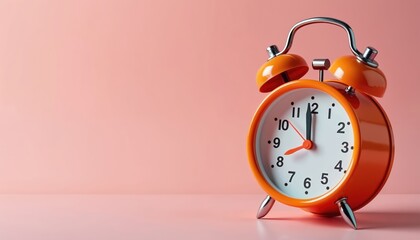 Orange vintage alarm clock stands against soft pink backdrop. Classic retro horologe design decor. Wake up call early morning, time concept, deadline. Retro design, nostalgic, chic, old fashioned.