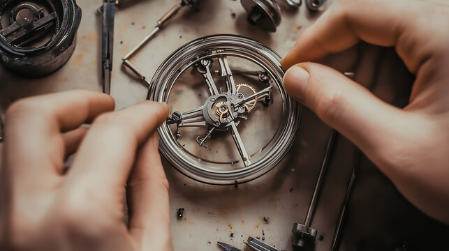 Artisanal watchmaker repairing a luxury timepiece. Close-up photography. Design for skilled craftsmanship, horological art, and precision mechanics concept