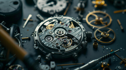 Intricate Timepiece Craftsmanship: A close-up shot showcases the meticulous process of watch repair, with gleaming gold components, tools.