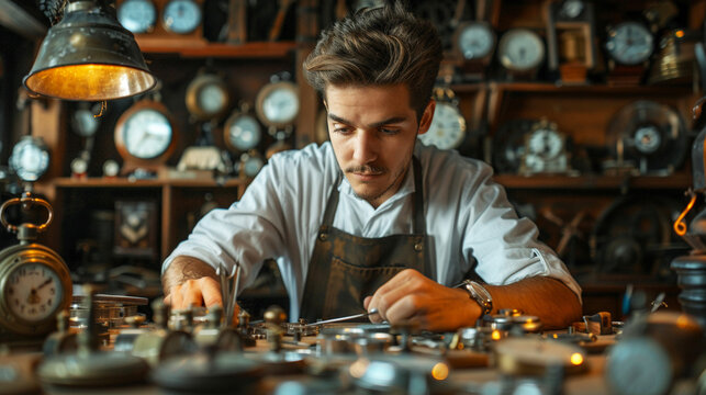 A meticulous watchmaker in a workshop the photo captures a young male artisan in a neat apron