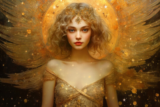 Young woman like Virgo zodiac sign in gold confetti against night sky