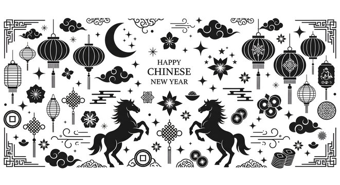 Black and white Chinese New Year illustration with horse and lanterns Classic monochrome artwork featuring traditional Chinese lanterns clouds florals and horse silhouettes