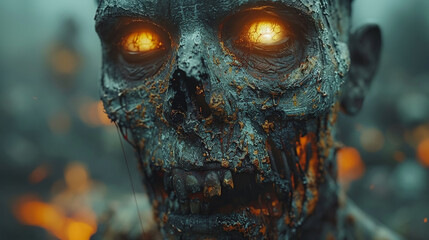 Close-up portrait of a horrible scary zombie with glowing eyes. Halloween dead walker concept, blur background illustration.