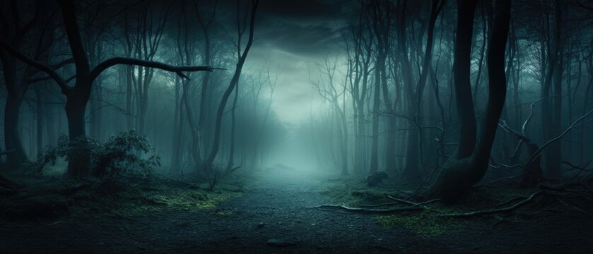 Misty spooky forest background, gloomy trees in scary horror foggy woods Happy Halloween dark night creepy nature mist fantasy atmosphere mystery dramatic landscape fall nightmare scenery. Copy space