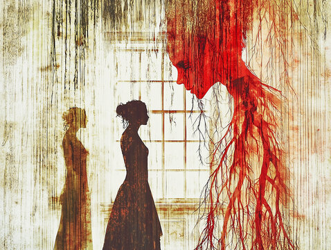 Horror Illustration with Blood-Red Figure in Haunted Mansion