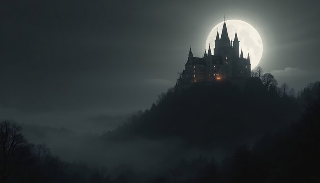 Dramática silueta de castillo con luna llena que crea una atmósfera inquietante para temas de fantasía.