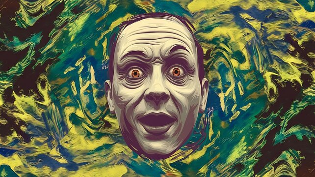 A surprised man with yellow eyes against a yellow and blue abstract background, perfect for a Halloween or horror themed design.
