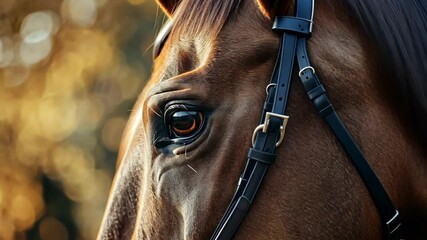 A close-up shot of a brown horse's eye, captured in a field with a blurry background of golden light