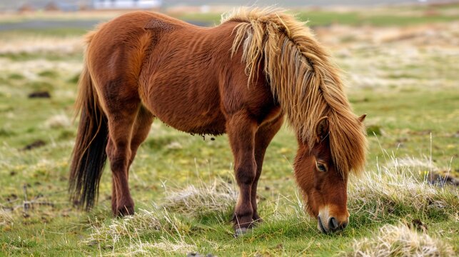 An Icelandic pony grazing in a rural pasture on a farm in Iceland.