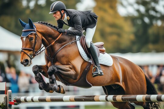 Equestrian show jumping horse and rider clearing fence in competition