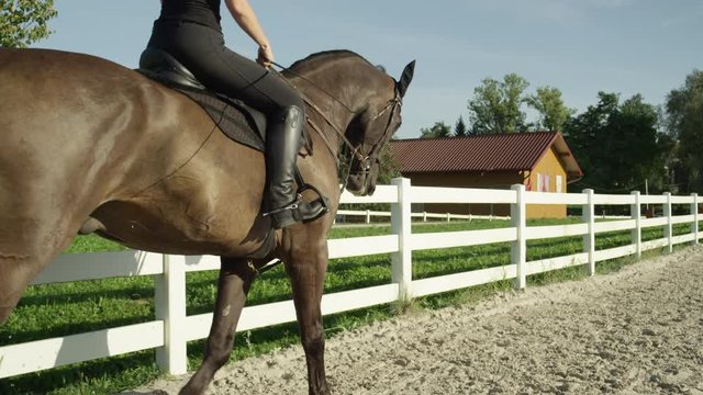 Young woman in protective hat with her horse in agriculture field at sunny daytime