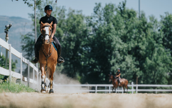 Elegant equestrian on a horse in autumn, showcasing the grace of horseback riding, ideal for equestrian magazines and lifestyle editorials, with potential for text overlay.