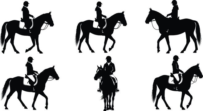 Silhouette set of horse riding girl, equestrian training poses, horseback riding motion illustration, black and white vector clipart design