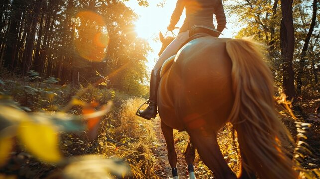Rider on horseback in a sunlit forest trail. Horseback riding in forest. Concept of equestrian sport, outdoor adventure, nature trail, sunlight