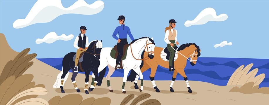 Family riding horse backs, walking on sea coast. Horseback riders, parents and child horseriding together. Happy equestrians, mother, father and kid at stroll in nature. Flat vector illustration