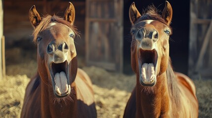 Two laughing horses in barnyard setting during daytime