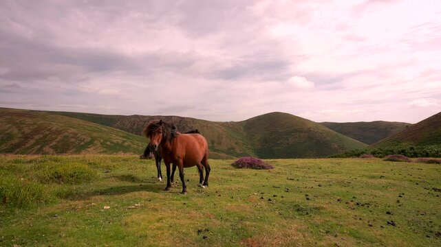 wild ponies grazing in the heath-land of the New Forest in Hampshire south east England UK