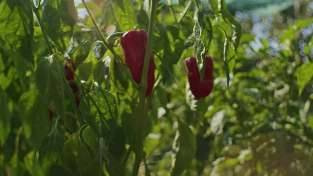 Red bell peppers growing in sunlight. Organic farming and healthy food concept. Design for vegetable market advertising, horticulture educational materials.