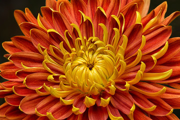 Close-up of a Japanese fall-flowering Kiku or chrysanthemum in orange and yellow.