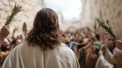 Sacred entry: Palm Sunday, Jesus Christ's arrival, Jerusalem celebration, joyous crowds, palm branches, religious event, biblical tradition, holy journey, spiritual triumph, divine arrival.