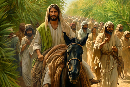Biblical scene of Jesus riding into Jerusalem during Easter Week.