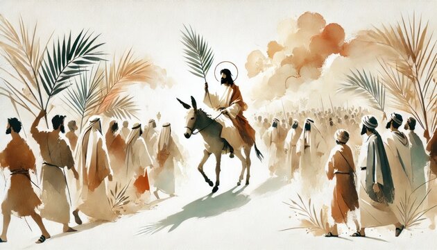 Biblical Illustration: Jesus' Triumphal Entry, Jerusalem, Donkey Ride, Crowds with Palm Branches, Beige Background, Copyspace