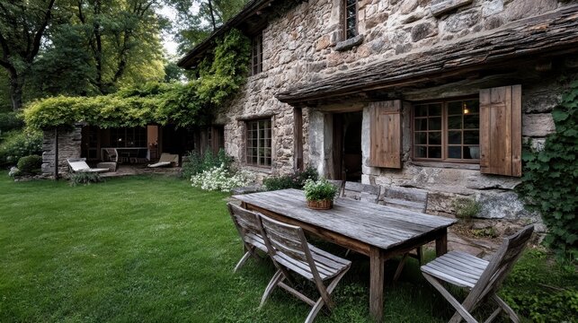 The cozy backyard of a rustic stone house is furnished with a wooden table and chairs, surrounded by lush plants and greenery, creating an inviting and relaxing outdoor space.