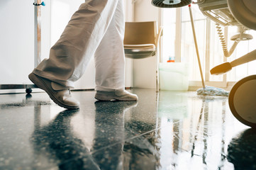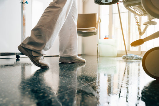 Diverse team of nurses washing floor and changing bed in hospital ward