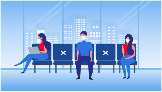 New normal concept and social distancing people keep distance from each other and wearing face mask prevention from disease outbreak vector illustration. New normal after COVID-19 pandemic concept